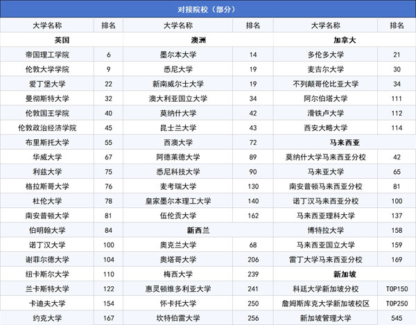 与英国、澳洲、新加坡、新西兰、加拿大、瑞士、马来西亚等海外多所名校直接对接,课程体系获百所知名院校认可,所有对接院校均为中国教育部认可院校,名单在中国教育部监管网上可查且所得文凭均可获得中国教育部认可。